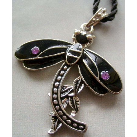 This vintage style dragonfly pendant is made of silvertone alloy metal with purple acrylic diamond and black enamel. A black silk cord is included for necklace. Free jewelry pouch.
