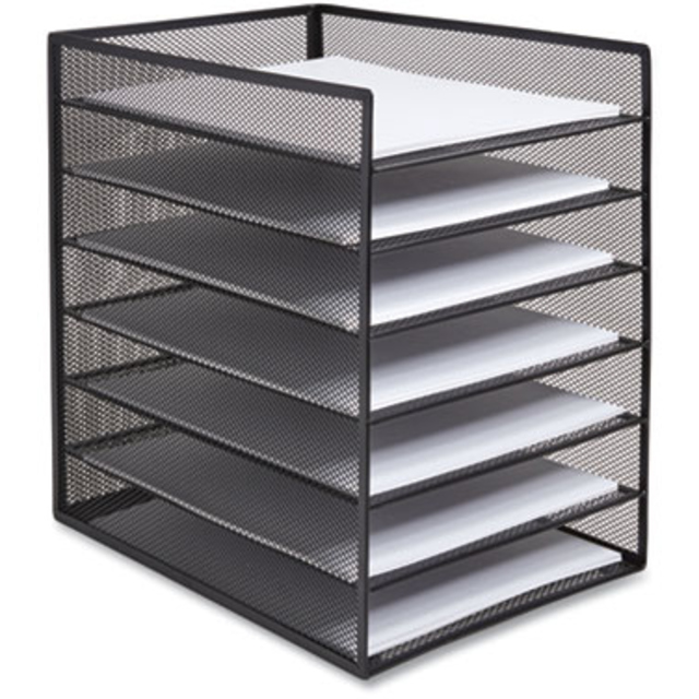- Reinforced mesh ribbing prevents bowing. Adjusted height of organizer back won't let paper slip off top shelf and fall behind the sorter.