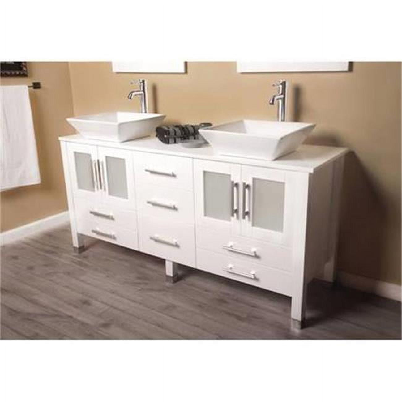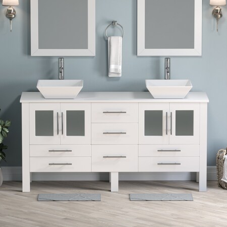 Cambridge Plumbing 63 inch Solid White Wood Vanity with Porcelain Counter top and Two Matching Vessel Sinks. Two Long-stemmed Chrome faucets and drains.