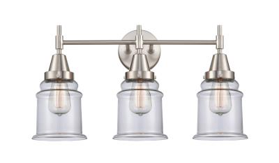 INNOVATIONS LIGHTING 447-3W-SN-G182-LED Caden Bath Vanity Light. Innovations Lighting Caden 3 Light 24 inch Satin Nickel Bath Vanity Light. Material: Steel, Glass. Metal Finish(Body): Satin Nickel. Metal Finish (Canopy/Backplate): Satin Nickel. Dimension(in): 12.5(H) x 24(W) x 8.25(Ext). Maximum Wattage Per Socket: 100. Bulb: (3)3.5 Watt LED Vintage Medium Base Bulb Included. Dimmable: Yes. Color Temperature(Kelvin): 2700. Lumens: 350. Color Rendering Index(CRI): 82. Voltage: 120. Glass Shade Description: Clear Large Cone. Glass Type: Transparent. Glass or Metal Shade Shape: Cone. Glass or Metal Shade Color: Clear. Shade Material: Glass. Shade Size (Diameter x Height)(in): 6 X 7.25. Shade Fitter Measurement(in): 3.25 inch Fitter. Backplate Dimensions(in): 5.25 X 0.875. Duo Mount: No. Certification: UL & ETL, Damp Location. Sharp lines and dramatic styling.
