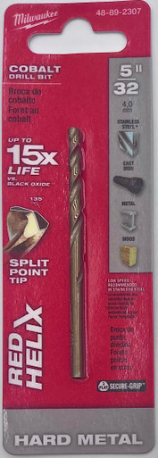 Milwaukee Thunderbolt 5/32" 3-1/8" OAL Cobalt Drill Bit, 48-89-2307. Milwaukee® Thunderbolt® Cobalt drill bits are designed for extreme durability and long life in specialty applications. The Thunderbolt® web features a thicker core than a standard drill bit, which provides ultimate strength and protects against side-load breakage. A specially designed parabolic flute form clears chips and debris fast to keep the bit cool. A precision start, 135 Split Point tip starts on contact to keep the bit from walking for fast accurate holes. Excellent for drilling on curved surfaces, requires less effort to drill and is highly recommended for use with portable drills. Thunderbolt® Web, Provides Longer Life and Faster Driller Times. Parabolic Flute, Clears Chips Faster. 135° degree Split Point, Precision Start No Walking. Specialty Bit for Cast Iron and Stainless Steel., Lot of 5