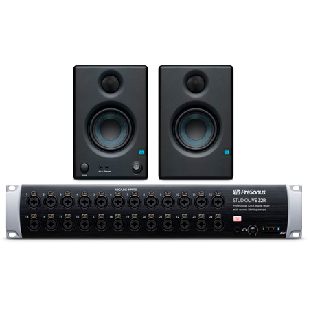 The PreSonus <strong>StudioLive 32R</strong> Series III rack mixer is a perfect partner for your StudioLive Series III console/recorder, serving as either a simple stage box or a combination stage box and monitor mixer. Since Series III rack mixers and consoles can network using AVB, you can connect your StudioLive 32R to a Series III front-of-house console with one lightweight CAT5e or CAT6 Ethernet cable, eliminating the need for a heavy, expensive copper snake-and the signal degradation that goes with long analog cable runs. You can even remote control the StudioLive 32R's preamps and phantom power from your networked Series III console. In stage box + monitor mixer mode, the StudioLive 32R not only serves as an excellent networked stage box, it is a full blown monitor mixer with far more processing and mixing power than any mixer in its class-all packed into just two rackspaces (2U).</p><p>Networking isn't the future of professional audio systems; it's here now. StudioLive 32R Series III rack mixers come equipped with an AVB Ethernet connection that enables you to network multiple StudioLive Series III mixers and compatible computers and stream up to 55 channels of audio to and from a Mac or Windows PC. You also get 40x40 recording via USB 2.0, giving you a choice of computer recording methods. Each channel can independently access its analog input or its dedicated digital return from your computer.</p><p><strong>Eris E3.5 - Sound You Can Trust</strong><br />PreSonus® Eris-series studio monitors are used worldwide by audio engineers who need to hear every detail of their recordings. Ideal for gaming and home video production, the <strong>Eris E3.5</strong> employs the same technology as the larger Eris models to deliver studio-quality sound, with a smooth and accurate frequency response. Yet they're compact enough to fit almost anywhere.</p><p><strong>Woofers That Deliver A Cleaner Overall Sound</strong><br />Every Eris-series studio monitor utilizes a woven composite, low-frequency driver. The weave and nature of the Eris E3.5's 3.5-inch woofer result in a more constant dispersion pattern throughout the frequency range, resulting in less time-smeared audio and cleaner overall sound.</p><p><strong>Smooth High End And Wide Sweet Spot</strong><br />The Eris E3.5 is equipped with a one-inch silk-dome tweeter that produces a smooth and refined sound, accurately reproducing transients and high frequencies. The tweeter is designed to radiate sound with a fairly wide dispersion pattern, creating a large optimal listening area or "sweet spot" so you can move around and still hear everything accurately.</p>