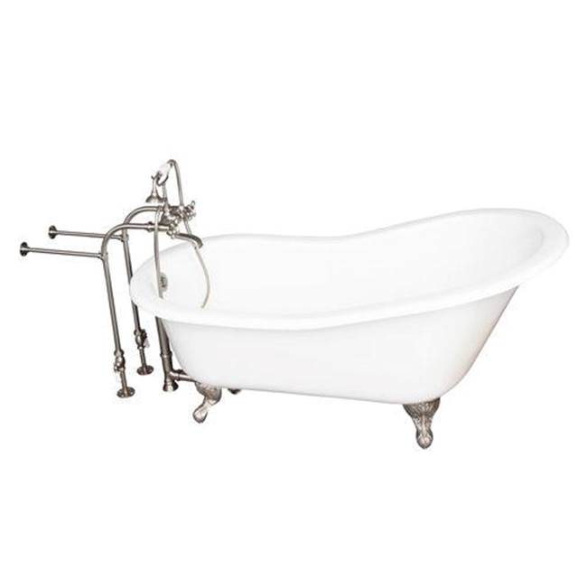 - Kit includes 67" Cast Iron Tub, Tub Filler with Hand shower, Bath Supplies and Tub Drain; Metal cross handles are 1/4 turn with ceramic disc cartridges; Telephone style hand shower includes cradle and 60" hose; Freestanding bath supplies are 30" high with stops and supports; Tub drain has twist and lift stopper