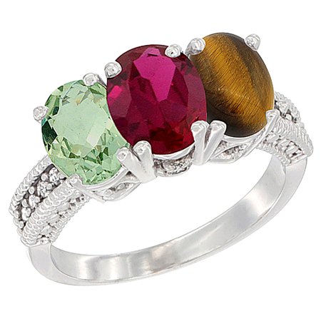 10K White Gold Natural Green Amethyst, Enhanced Ruby & Natural Tiger Eye Ring 3-Stone Oval 7x5 mm Diamond Accent, sizes 5 - 10