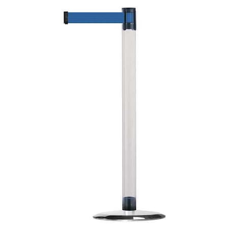 Barrier Post with Belt, Post Material Polycarbonate, Post Finish Clear, Post Height 38 in, Post Dia. 2 1/2 in, Base Type Standard, Base Dia. 14 in, Base Material Steel, Base Finish Polished Chrome, Number of Belts 1, Belt Length 7 1/2 ft, Belt Color Blue, Belt Width 2 in, Indoor, ADA Compliance Yes
