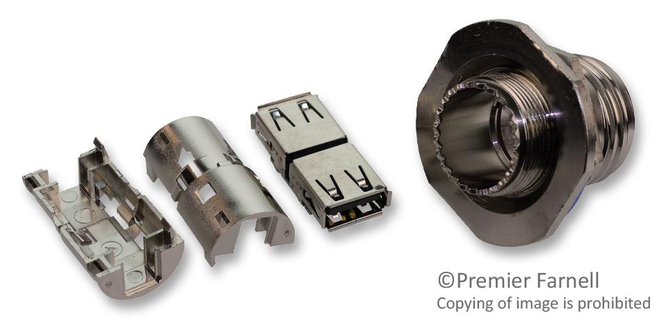 Sealing: IP68<br>Shielding: Yes<br>Connector Type: Circular<br>Connector Style: Receptacle<br>Mounting Type: Jam Nut - Rear Mount<br>Contact Style: USB-A Socket<br>Termination Method: Female USB-A<br>Shell Material: Aluminium<br>Shell Plating: Nickel<br>Shell Color: Silver<br>Insert Material: Thermoplastic<br>Operating Temperature: -40 to +185 (-40 to +85)<br>Contact Mating life: 500<br>RoHS: Yes