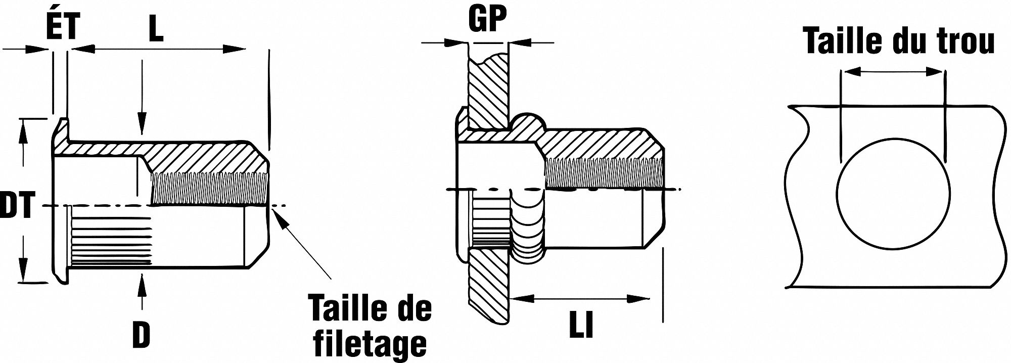 RIVET NUT, LARGE FLANGE/ KNURLED BODY/OPEN END, 2 MM MAX GRIP, ZINC YLW, M4 X 0.7, STEEL, PK 100
