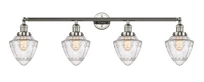 This 4 light Bath Vanity Light from the Franklin Restoration Bullet collection by Innovations Lighting will enhance your home with a perfect mix of form and function. The features include a Polished Nickel finish applied by experts. Product Features Include: Brand: Innovations Lighting, Collection: Franklin Restoration Bullet, SKU: 215-PN-G664-7-LED, UPC: 729625078798, Category: Bathroom Vanity Light, Finish: Polished Nickel, Glass: Seedy, Material: Steel/Cast Brass/Glass, Designer: Bruno Marashlian, Width: 45.75 in., Height: 15.00 in., Extension/Depth: 8.00 in., Backplate/Canopy Width: 4.50 in., Backplate/Canopy Length: 0.00 in., Backplate/Canopy Thickness: 0.75 in., Height from Center of Wall Opening: 2.25 in., Install Position: Reversible, Weight: 10.20 lb., Warranty: 2 Year Finish, Lifetime Electrical, Bulbs Included: Yes, Bulb Category: LED, Primary Bulb(s): 4 x 6.00 watts Medium Base ST64 Vintage, Color Temperature: 2700K, Color Rendering Index: 82.0000, Total Lumens: 600, Voltage: 120, Safety Rating: Damp Location, Title 20 Approved