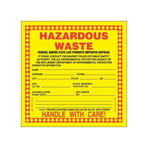 - <b>Price For:</b> Each <b>Legend/Background Color</b>: Red/Yellow <b>Shape</b>: Square <b>Language</b>: English <b>Header Background Color</b>: Yellow <b>Self-Adhesive</b>: Yes <b>Item</b>: New Jersey Hazardous Waste Label <b>Height</b>: 6"