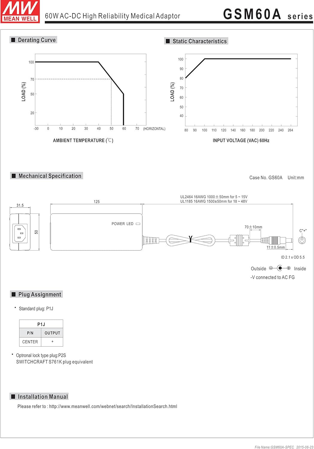<b>Features</b><br>Universal AC input / Full range<br>Medical safety approved(2xMOPP)<br>Suitable for BF application with appropriate system consideration (B-Type only)<br>low leakage current <50uA(100uA for A Type)<br>No load power consumption <0.1W<br>Energy efficiency Level VI (5~9V for Level V)<br>Comply with EISA 2007/DoE, NRCan, AU/NZ MEPS, EU ErP and meet CoC Version 5<br>High efficiency up to 91.5%<br>A-Type: Class I(with earth Pin) B-Type: Class II(without earth Pin)<br>Protections: Short circuit / Overload / Over voltage / Over temp.(GSM60 A/B)<br>Fully enclosed plastic case<br>LED indicator for power on<br>Optional lock type DC plug<br>3 years warranty