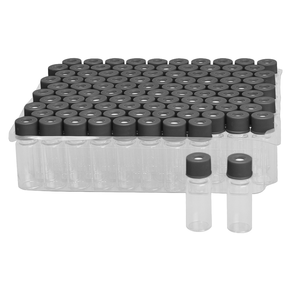 Chromatography Vials, Pre-assembled Convenience Pack, Standard Opening Screw, 8x425mm Thread, Clear Vial, Black Polypropylene Cap, PTFE Septa, 0.010", 100/CS | Southern Labware