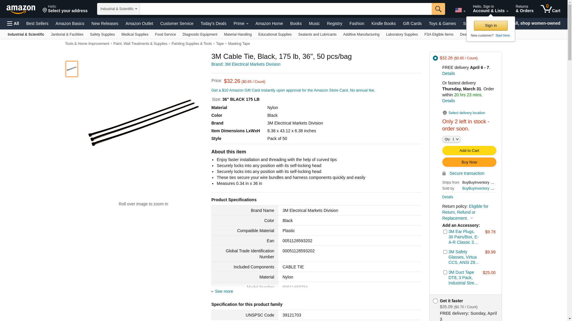 3M Electrical Markets Division Cable Tie, Black, 175 lb, 36', 50 pcs/bag