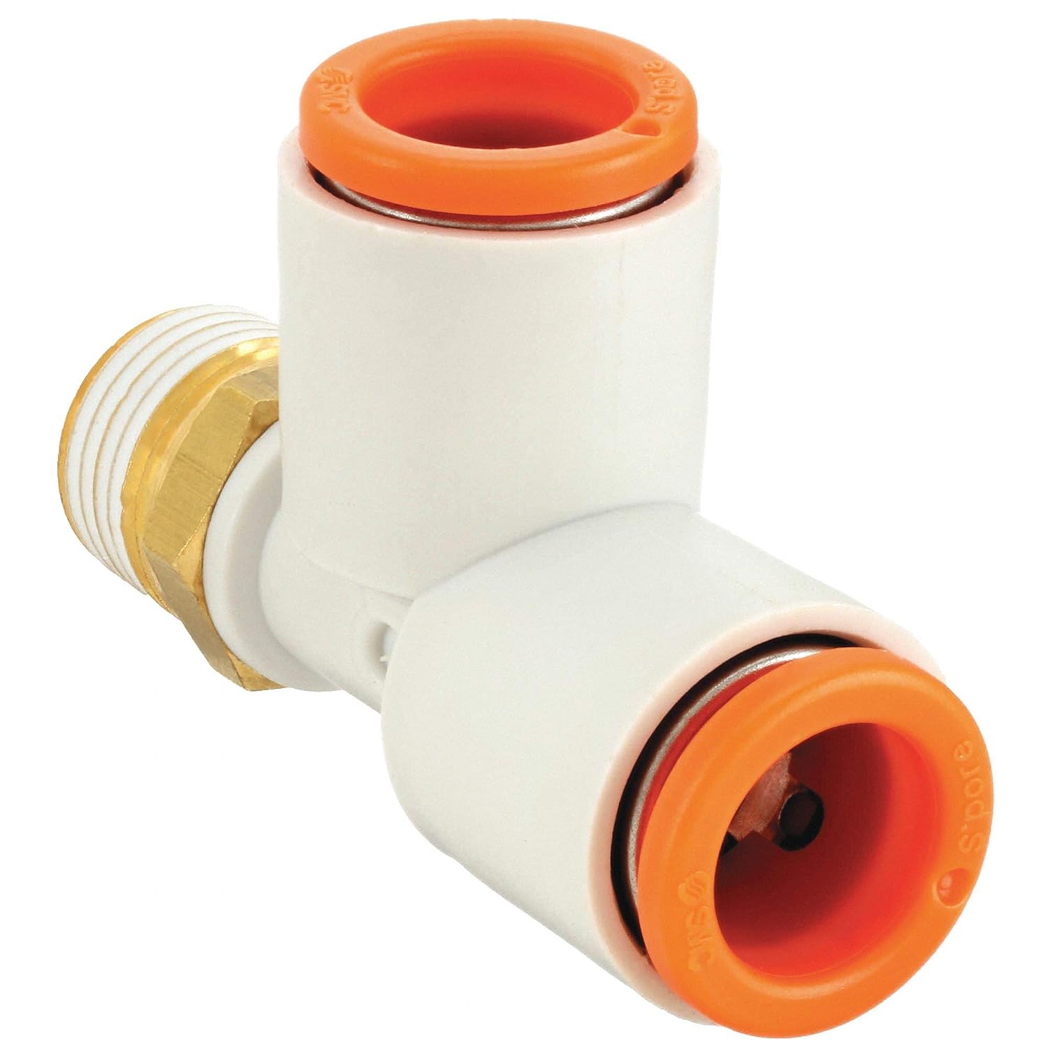 Male Run Tee, Application Air, Non-Potable Water, Color White, Fitting Side A Connection Type MBSPT, Fitting Side B Connection Type Push-to-Connect, Fitting Side C Connection Type Push-to-Connect, Fitting Side A Pipe Size 3/8 in, Includes Pre-Applied Thread Sealant Yes, Fitting Side B Tube Outer Diameter 3/8 in, Fitting Side C Tube Outer Diameter 3/8 in, Fitting Material PBT, Maximum Operating Pressure 145 psi, Maximum Operating Temperature 140 Degrees F, Overall Length 49 11/16 mm