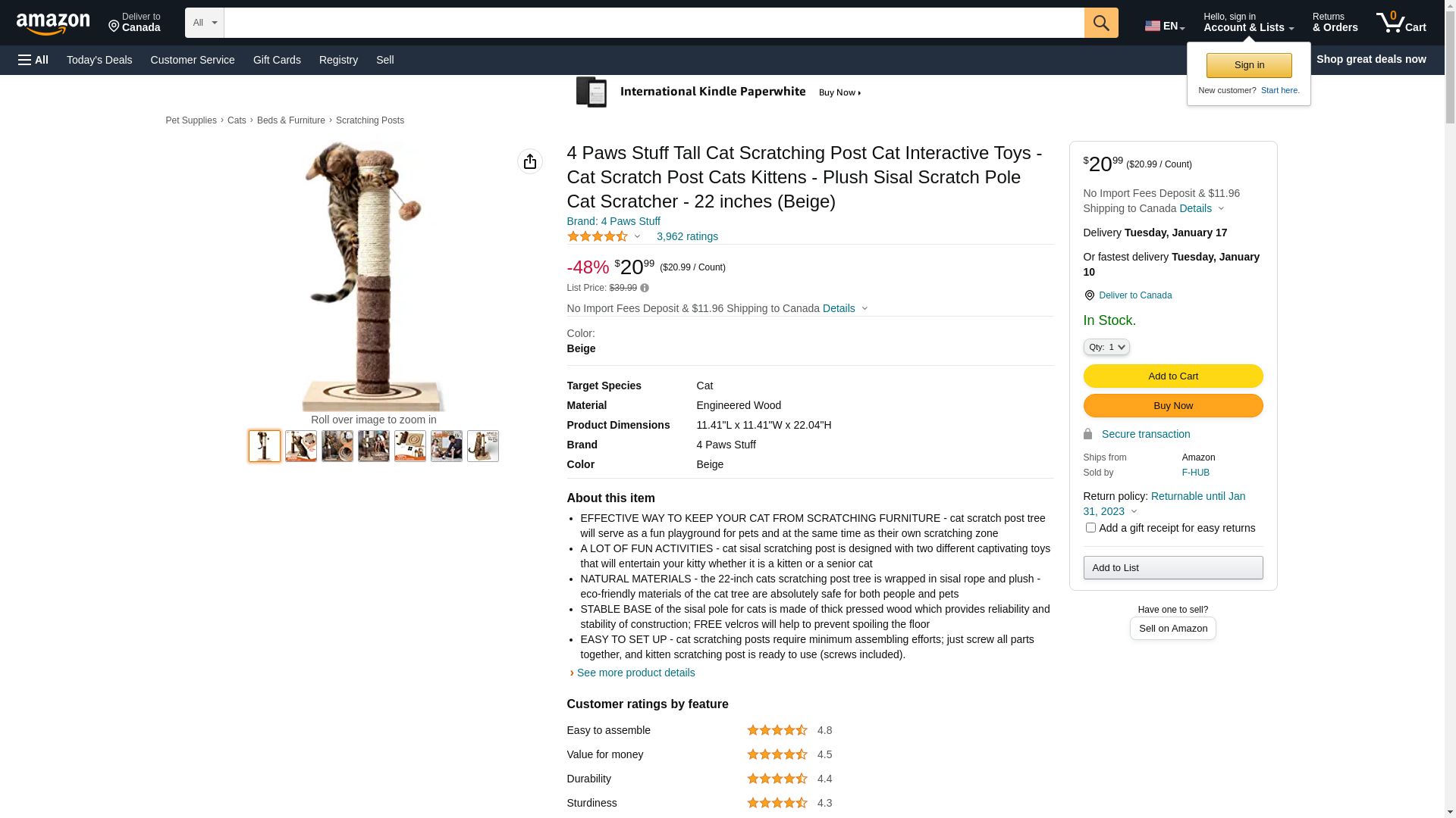 4 Paws Stuff Tall Cat Scratching Post Cat Interactive Toys - Cat Scratch Post Cats Kittens - Plush Sisal Scratch Pole Cat Scratcher - 22 inches (Beige): Maxedbuy.com