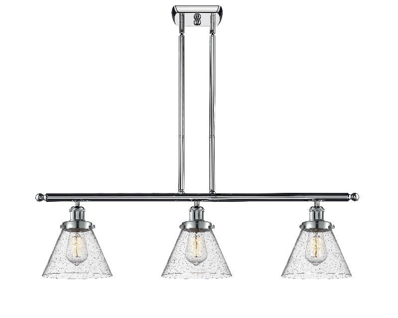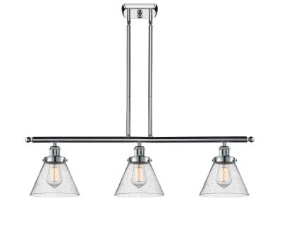 INNOVATIONS LIGHTING 916-3I-PC-G44 Large Cone 3 Light Island Light part of the Ballston Collection. Collection: Ballston. Metal Finish (Body): Polished Chrome. Metal Finish (Canopy/Backplate): Polished Chrome. Glass or Metal Shade Color: Seedy. Material: Steel, Cast Brass, Glass. Shade Material: Glass. Dimension(in): 11(H) x 36(W) x 8(Ext). Canopy Dimension(in): 6(L) x 4.5(W) x 0.75(H). Min/Max Height(With Shade, Cord or Included Stems & Canopy)(in): 20.375/44.375. Wire/Cord: 10 Feet Of Wire. Shade Size(in): 6(H) x 7.75(Dia). Bulb: (3)60W Incandescent Medium Base(Not Included). Voltage: 120. Dimmable: Yes. Color Temperature(Kelvin): 2200. CRI: 99.9. Lumens: 220. Sloped Ceiling Compatible: Yes. Glass Shade: Seedy Large Cone. Glass Type: Seeded. Glass or Metal Shade Shape: Cone. Shade Fitter Measurement: 3.25 inch Fitter. Style: Industrial, Modern Contempo, Restoration-Vintage, Transitional . Ul Certification Type: Damp Location. Warranty: 2 Year Finish, Lifetime Electrical.