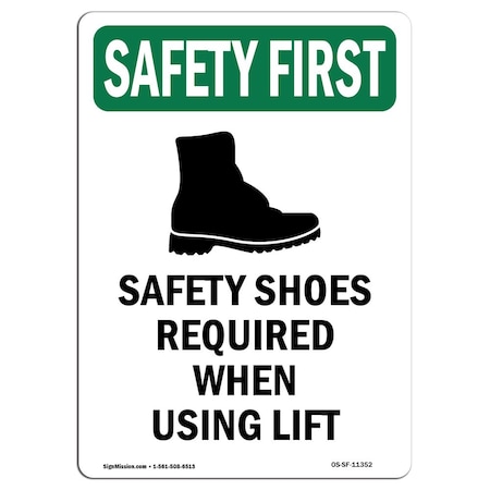 OSHA SAFETY FIRST Sign, Safety Shoes Required W/ Symbol, 14in X 10in Aluminum