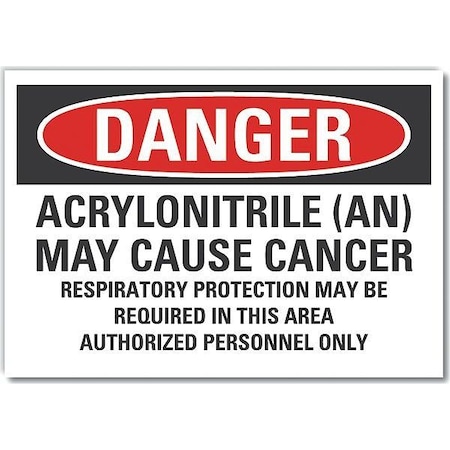 Acrylonitrile Danger Label, Horizontal Rectangle, Number of Printed Sides 1, English, Sign Format Traditional OSHA, Sign Legend Acrylonitrile (An) May Cause Cancer Respiratory Protection May Be Required In This Area Authorized Personnel Only, Sign Legend Background Color White, Sign Legend Style Text