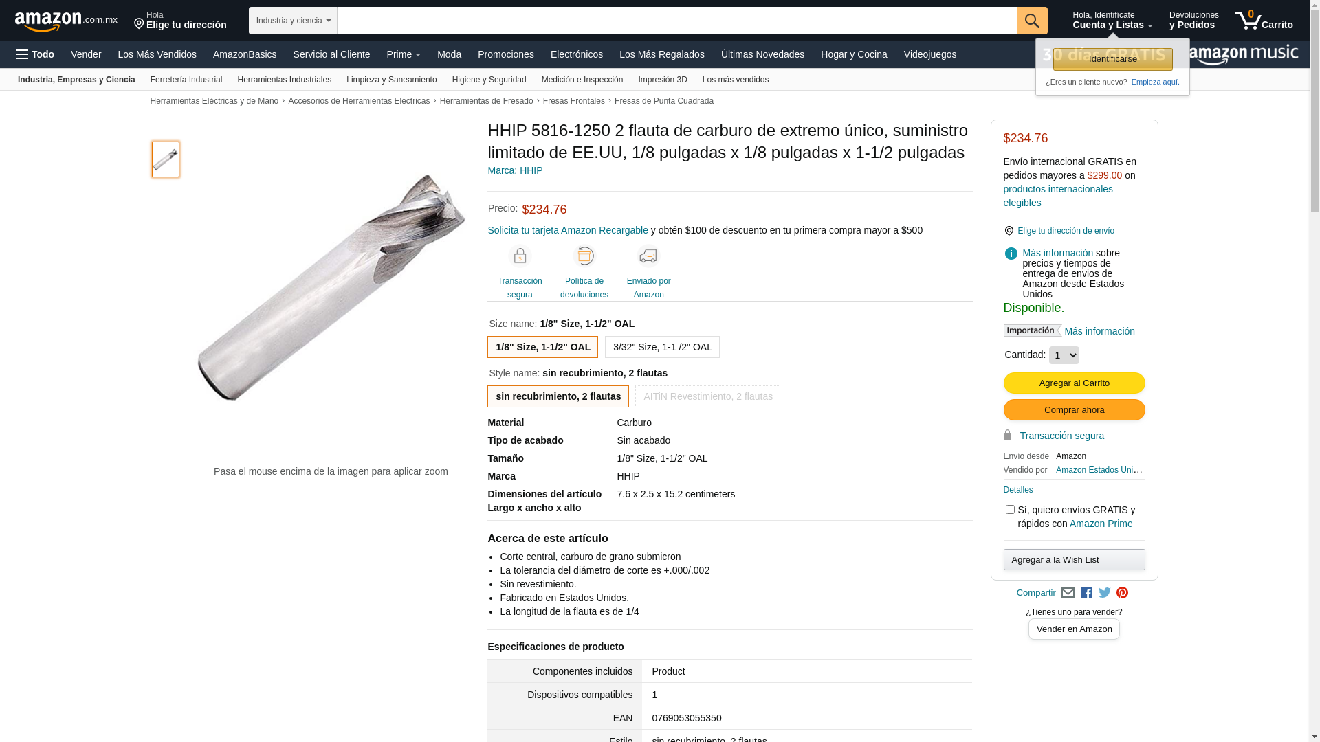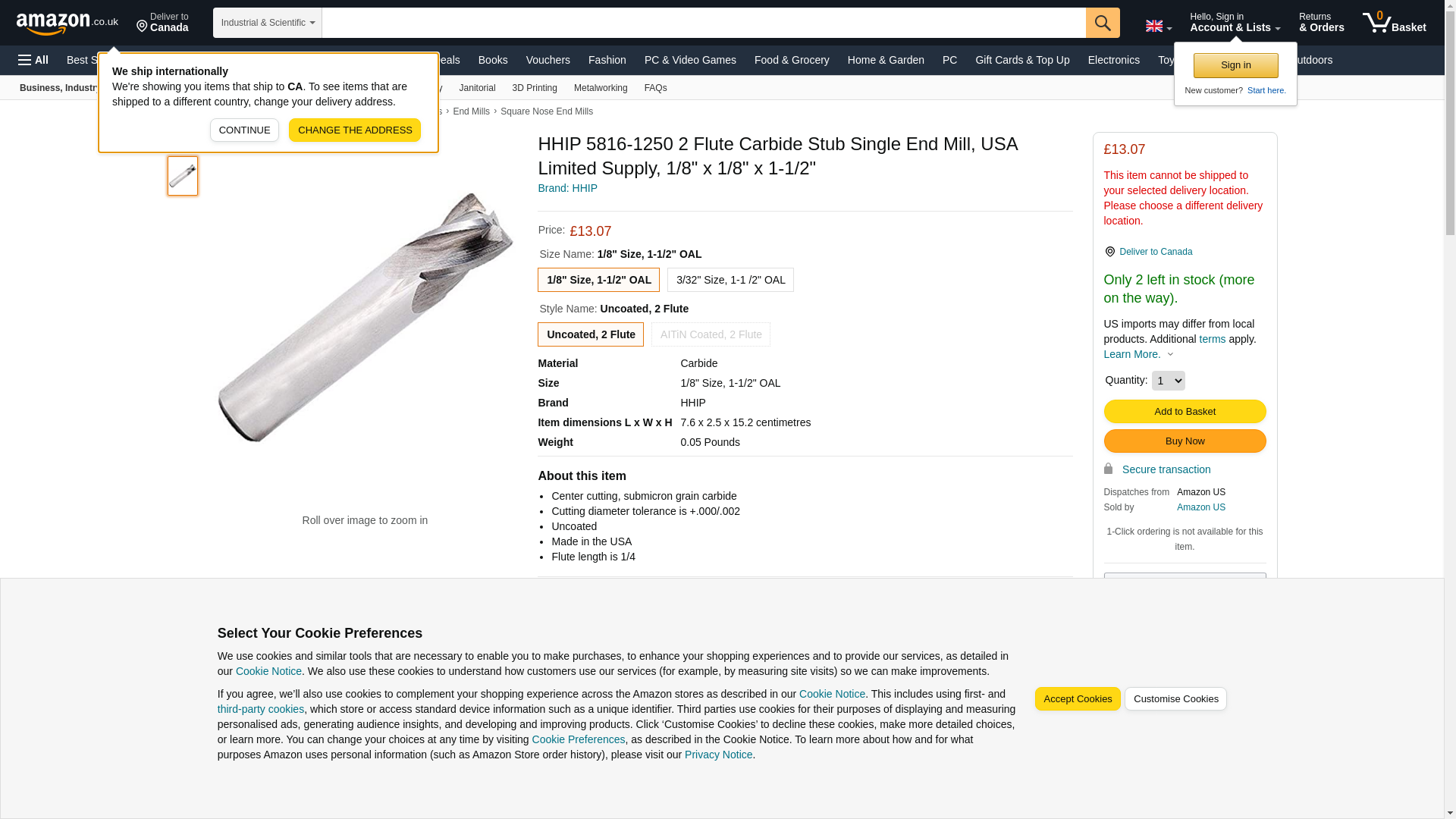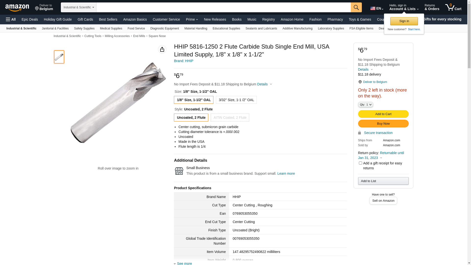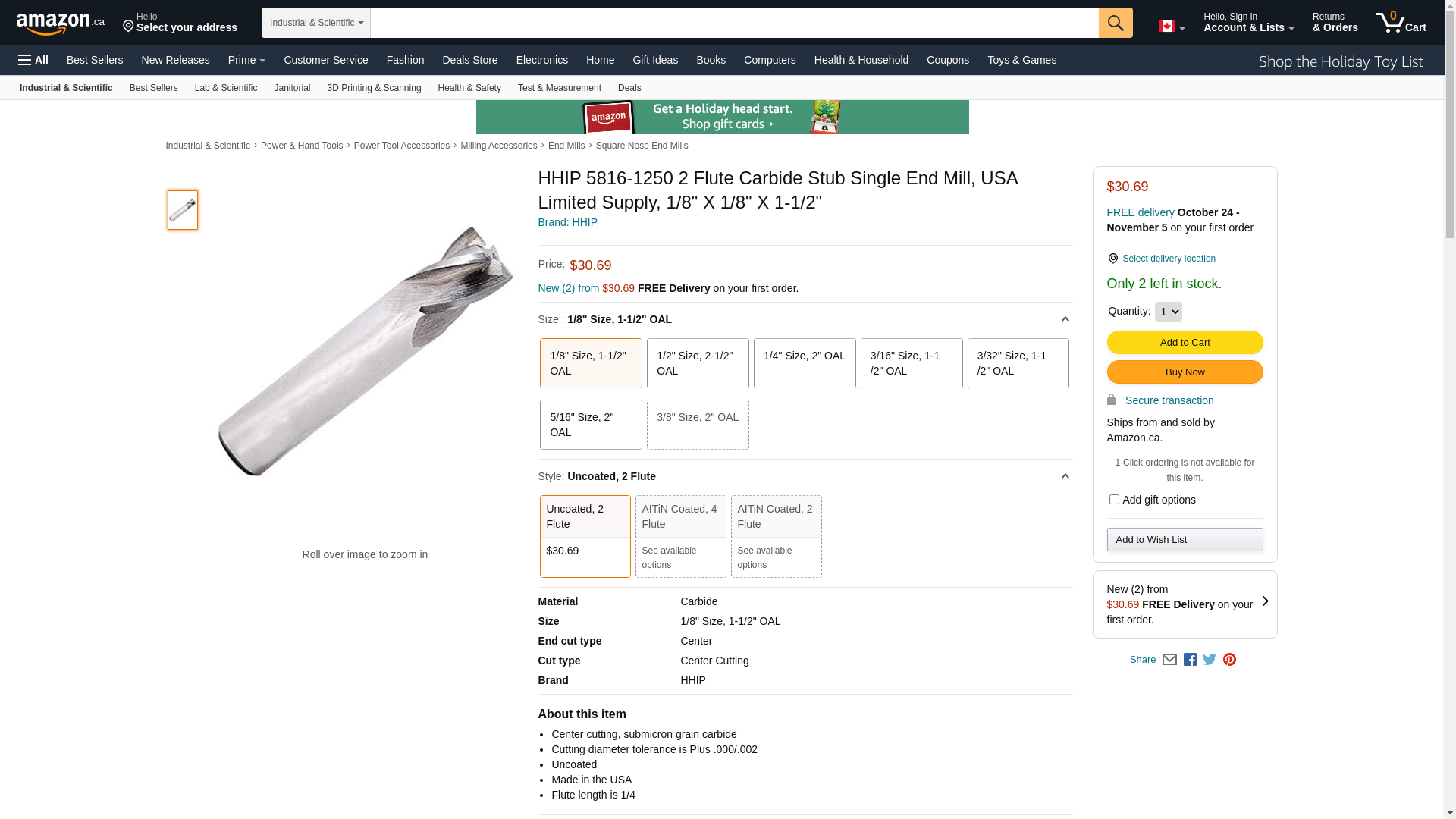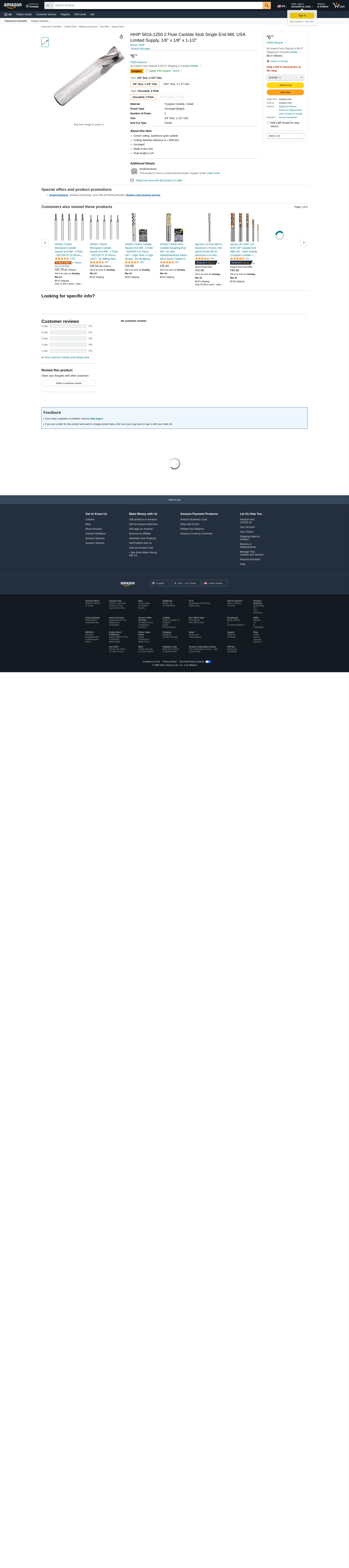 HHIP 5816-1250 2 Flute Carbide Stub Single End Mill, USA Limited Supply, 1/8" x 1/8" x 1-1/2"