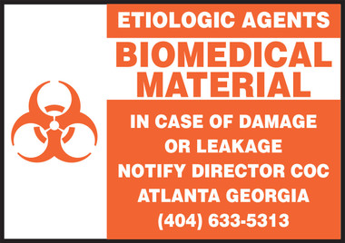 ETIOLOGIC AGENTS BIOMEDICAL MATERIAL IN CASE OF DAMAGE OR LEAKAGE NOTIFY DIRECTOR CCC ATLANTA GEORGIA (404)633-5313
