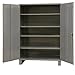 DURHAM Industrial Cabinets feature double doors that swing open 180 for complete access to contents. Full-height flush doors have full-length piano hinges. 6-5/8" wide door reinforcement adds strength. Three-point lock with keyed handle and -5/16" dia. lock rods. Shelves adjust on 4" centersno tools needed to install. Durable gray powder coat finish.