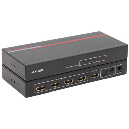 The Hall Technologies <b>SP-HD-4B</b> can distribute one (1) DVI or HDMI audio/video source to four (4) identical outputs simultaneously without any loss. It is compliant to HDCP 1.4 and supports 4K UHD resolutions up to 4K@30Hz (4:4:4), HDR and 3D. This splitter can drive each buffered output up to 12 meters (40 feet) on quality HDMI cables.</p><p>The SP-HD-4B is HDCP compliant and digitally splits and buffers the input signal for a 100% perfect image and sound reproduction on all outputs. The splitter also provides analog L/R and digital SPDIF (TOSLINK) outputs for connection to audio amplifiers, headphones, etc.</p>
