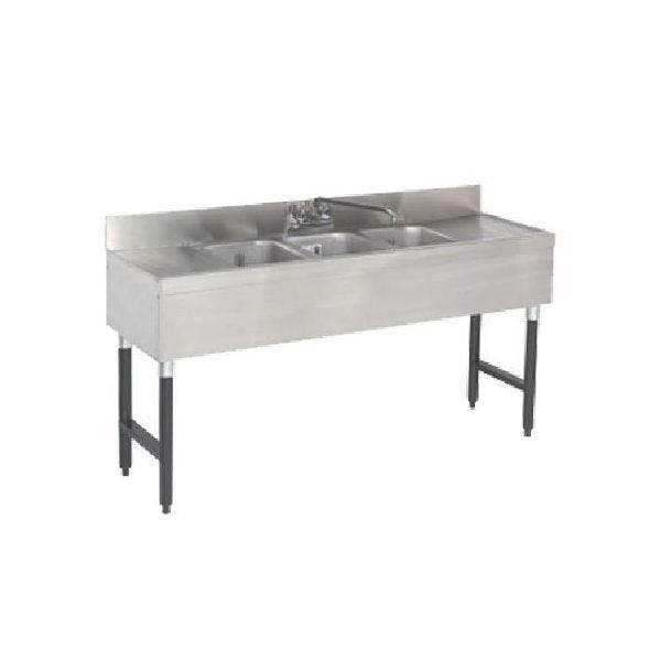 SLB-43L-X Lite Series Underbar Sink Unit 3-compartment 48W x 18D x 33H overall 4 backsplash (3) 10W x 14D x 10deep sink bowls with (1) splash mounted faucet with 10 spout 9W drainboard on right stain