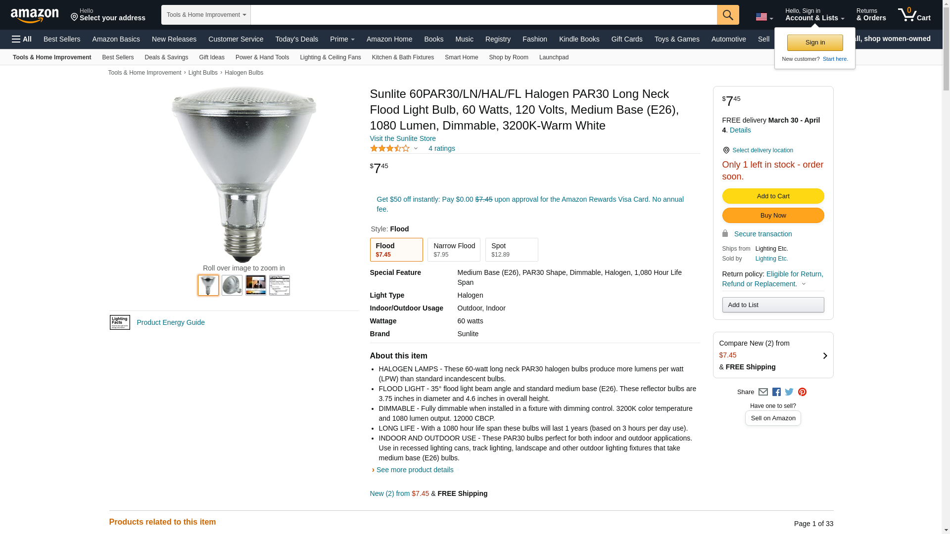 Sunlite 26065-SU 60PAR30/LN/HAL/FL 60-watt Halogen PAR30 Reflector Long Neck Bulb. 60 Watt, 120 Volt. 1, 080 Hour Ave...