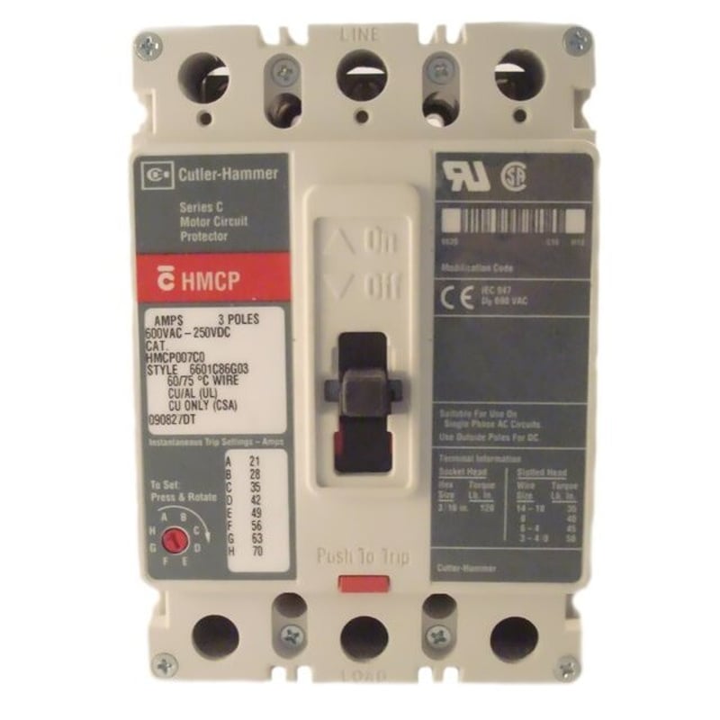 <br /><br /> Item: Circuit Breaker<br /> Amps: 7<br /> Number of Poles: 3<br /> Circuit Breaker Type: Standard<br /> AC Voltage Rating: 600VAC<br /> DC Voltage Rating: 250VDC<br /> For Use With: Eaton MCC Eaton, Switchboard, Westinghouse, Allen Bradley MCC, Rockwell Automation Enclosed Control<br /> Series: HMCP<br /> Trip Type: Thermal Magnetic<br /> Terminal Connection: Line/Load Lug<br /> Max. AIR Rating: 65 kA<br /> Phase Connection: ABC<br /> Mounting: Free Standing<br /> Height: 10.00"<br /> Width: 4.13"<br /> Depth: 4.06"<br /> Min. Wire Size: 14 AWG<br /> Max. Wire Size: 1/0 AWG<br /> Instantaneous Trip: Fixed<br /> High Amp Trip Setting: 5.7A<br /> Low Amp Trip Setting: 1.5A<br /> Frame Size: 250/J<br /> Phase: 3<br /> Standards: UL Listed, IEC, CSA Certified, CCC, CE Marked, NEMA, IEC, VDE