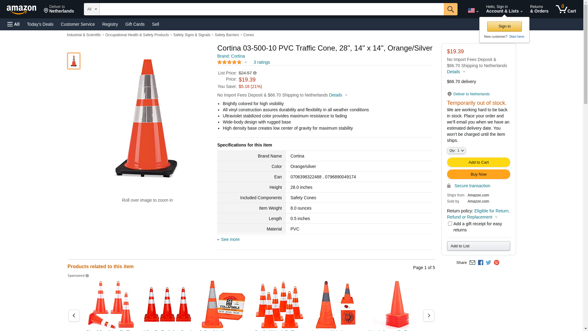 Cortina 03-500-10 PVC Traffic Cone, 28", 14" x 14", Orange/Silver