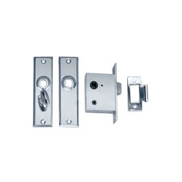 Chrome plated zinc. Turn button lock. Screw size is #6. Case is 2-1/4" x 1-13/16". Escutcheon is 4-3/8" x 1-1/4". For door thickness of 1" to 1-3/8".