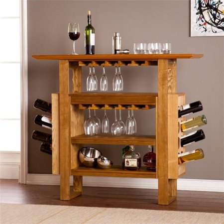 Clean simplicity creates quiet elegance in this handsome weathered oak console bar. Airy and open shelving, glassware racks, and bottle holders organize your hosting needs with ease while the ample tabletop provides excellent space for serving appetizers and cocktails or displaying your dapper stemware collection. Speak midcentury volumes in your dining room, hall, or parlor with this unassumingly cool console.Finish: Weathered OakMaterial: Manufactured Wood, Veneer, China OakTransitional midcentury modern style All wood look creates clean simplicityConvenient slim design, bar height excellent for small spacesFeatures 10 glassware racks and 3 open shelvesRiddling sides for bottle storageFits 16 standard size wine bottlesSpecifications:Overall Product Dimension: 42.5" H x 47.25" W x 15.5" DProduct Weight: 94 lbsSupports up to: 50 lbs (console top), 20 lbs (each shelf)