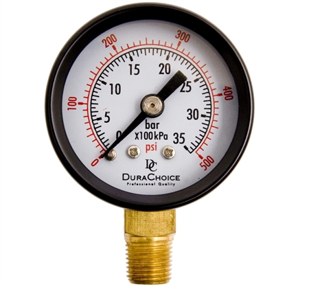 DuraChoice PA158L-500 dry utility pressure gauge. 1-1/2" dial size. 1/8" NPT lower mount fitting. Steel case with brass fittings. Measures 0-500 PSI.