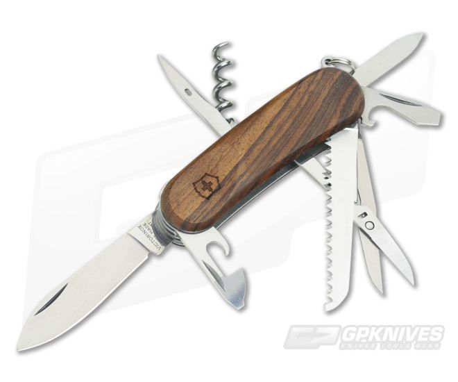 - PRODUCT DETAILS: Swiss made pocket knife with 13 functions. Height: 0.9 in, Length: 3.3 in., Weight: 3.1 oz., MM: 85mm, Scale Material: walnut wood