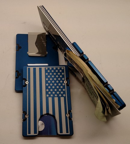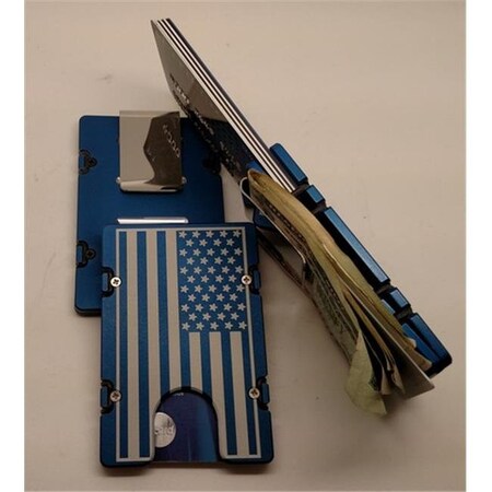 The Billet Aluminum Front Pocket Wallet Credit Card Holder with RFID Protection has been minimally machined from two pieces of solid 6061 T6 aircraft grade aluminum Carry only what you need with its size easily adjustable to up to twelve cards for traveling or networking events Comes with a removable money clip money organizer pusher card for your currency and four extra Orings This wallet credit card holder is anodized then laser engraved The lightweight construction of this wallet lends itself to utter comfort The slim front pocket profile helps alleviate lower back pain while the tough construction keeps your information secure by blocking RFID Devices used to wirelessly steal your identity or credit card information Features. American Flag RFID Protected Aluminum Wallet Credit Card Holder. Wallet will never wear outSpecifications. Color Blue. Material Aluminum. Dimension 2 38 x 3 12 x 14