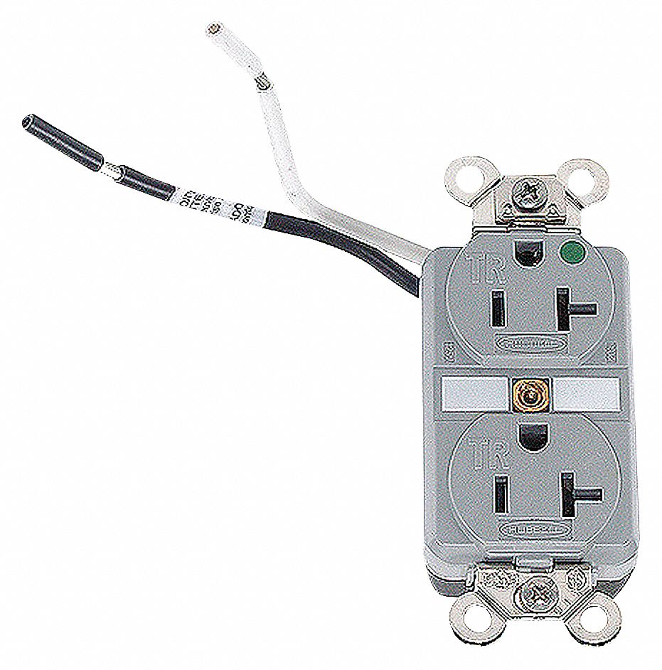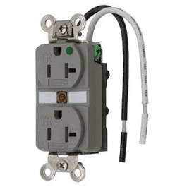 This hospital grade receptacle is designed to withstand the severe conditions of abuse that are unique to hospital environments. Built with nickel-plated bypass contacts that increase contact pressure and help lower operating temperature. The four-point grounding system provides redundant grounding for low resistance ground continuity, and thermoplastic polyester (RTP) back is tough and heat-resistant. To quality for the hospital grade designation and use of the green dot symbol, UL requires product performance to specific levels. These levels form an established baseline below which no manufacturer can fall and still carry a green dot.<br /><br /> Item: Receptacle<br /> Type - Plugs and Receptacles: Straight Blade<br /> Application Environment: Heavy Use Hospital Grade<br /> Amps - Plugs and Receptacles: 20<br /> NEMA Receptacle Configuration - Plugs and Receptacles: 5-20R<br /> Voltage - Plugs and Receptacles: 125VAC<br /> Number of Poles: 2<br /> Number of Wires: 3<br /> Tamper Resistant: Yes<br /> Weather Resistant - Plugs and Receptacles: No<br /> Outlet Type - Plugs and Receptacles: Standard Duplex<br /> Mounting Type - Plugs and Receptacles: Flush<br /> Color - Plugs and Receptacles: Gray<br /> Item - Plugs and Receptacles: Receptacle<br /> Wiring Method - Plugs and Receptacles: Wire Lead<br /> Surge Suppression: No<br /> Material: Thermoplastic<br /> Phase: 1<br /> HP: 1.0<br /> IP Rating: 20<br /> Power Indicator: No<br /> Corrosion Resistant: No<br /> Number of Gangs: 1<br /> Description: Grounding