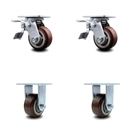 Polyurethane on Polyolefin Swivel Caster w/Main. Free Bearings Set of 4 w/4" x 2" Maroon Wheels - Includes 2 Swivel with Total Lock Brakes & 2 Rigid - 2400 lbs Total Capacity - Service Caster Brand