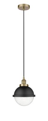 INNOVATIONS 616-1PH-AB-HFS-84-BK Edison 1 9 inch Multi Pendant Antique Brass. Style: Art Deco, Contemporary. Collection Name: Downtown Urban. Metal Finish(Body): Antique Brass. Metal Finish(Shade): Matte Black. Material: Steel, Cast Brass, Glass. Dimension(in): 12.5(H) x 9(W) x 9(Dia). Bulb: (1)60W Medium Base Incandescent(Not Included). Min/Max Height(Fixture Height with Shade,Cord or Included Stems & Canopy): 15.5/132.5. Voltage: 120. Dimmable: Yes. Color Temperature (Kelvin): 2200. Color Rendering Index (CRI): 99.9. Lumens: 220. Life Expectancy (Hours): 2000. Glass Shade Description: Matte Black Hampden 8" with Seedy glass. Glass Type: Transparent. Shade Shape: Globe/Orb. Glass or Metal Shade Color: Matte Black Hampden 8" with Seedy glass. Shade Material: Steel and Glass. Metal Shade Description: Matte Black Hampden 8" with Seedy glass. Shade Dimension(in): 9(W) x 8.5(H). Fitter Measurement (Glass Or Metal Shade Fitter Size): 3.25 inch Fitter. Sloped Ceiling Compatible: Yes. California Proposition 65 Warning Required: Yes. UL/ETL Certification Type: Damp Location.