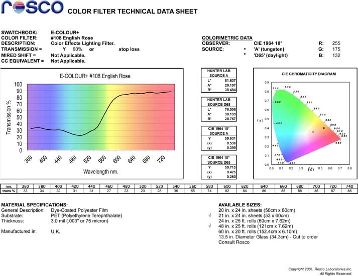 Buy the Rosco E-Colour #108, English Rose, 21"x24" Sheet at Full Compass Systems. 0% Financing and Free Shipping on thousands of items!