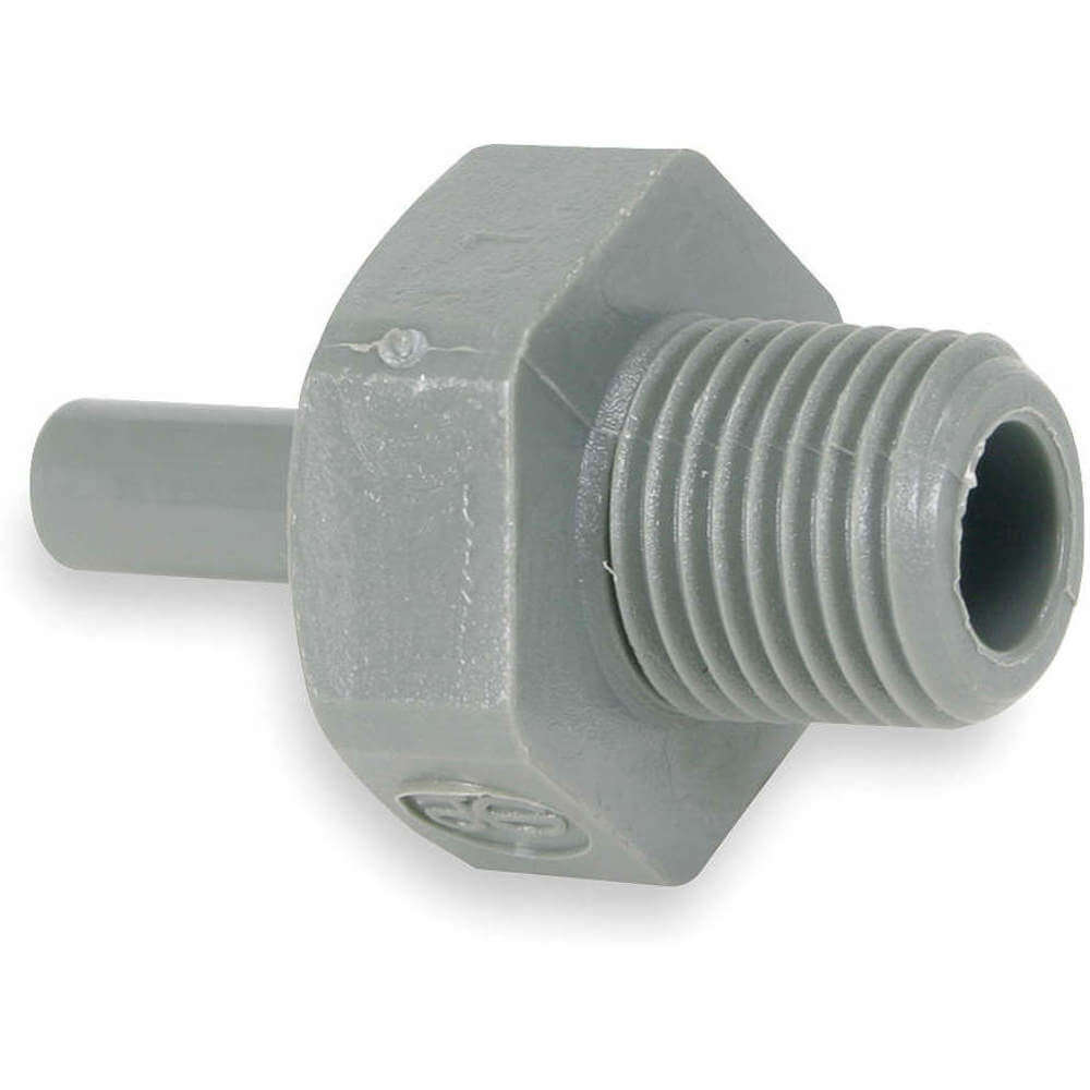 This plastic adapter helps create leakproof connections with various materials. It offers toolless installation, which is ideal for tight spaces. Suitable for cold and hot water distribution.<br /><br /> Item: Stem Adapter<br /> Tube Fitting Material: Acetal Copolymer<br /> Fitting Connection Type: Tube x Male BSPT<br /> Pipe Size - Pipe Fitting: 1/8"<br /> Stem OD: 1/4"<br /> Max. Pressure: 150 psi<br /> Color: Gray<br /> Temp. Range: -14 Degrees to 167 Degrees F for Air and 33 Degrees to 140 Degrees F for Water<br /> Standards: NSF-61 For Drinking Water, NSF-51 For Food And FDA For Food And Beverage<br />