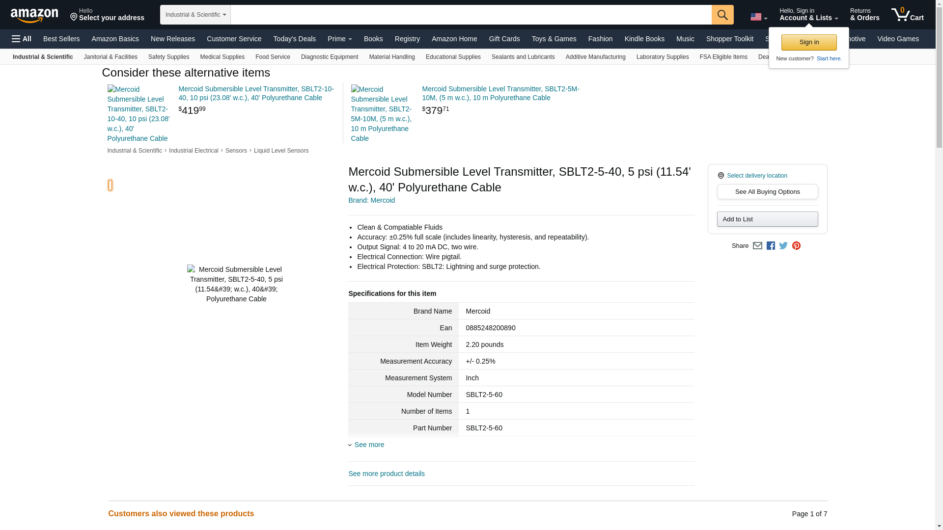 Mercoid Submersible Level Transmitter, SBLT2-5-40, 5 psi (11.54' w.c.), 40' Polyurethane Cable