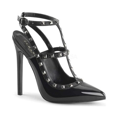 <ul> <li>5'' Stiletto Heel </li> <li>Open back </li> <li>T-strap pump </li> <li>Metal stud detail on straps and trim</li> </ul>