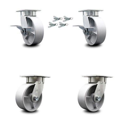 Kingpinless Semi Steel Cast Iron Swivel Top Plate Caster Set 4 w/6" x 2" Silver Wheels-Includes 2 Swvl w/Brakes and Bolt on Swvl Lcks&2 Swvl w/Bolt on Swvl Lcks-4800lbs Total Cpty-Service Caster Brand