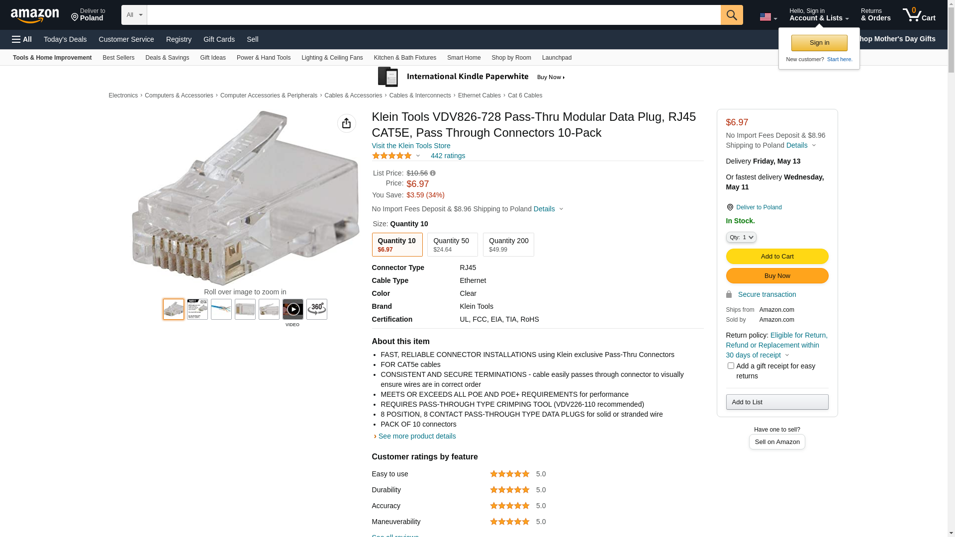 Klein Tools VDV826-728 Pass-Thru Modular Data Plug, RJ45 CAT5E, Gold Plated, Pass Through Connectors 10-Pack
