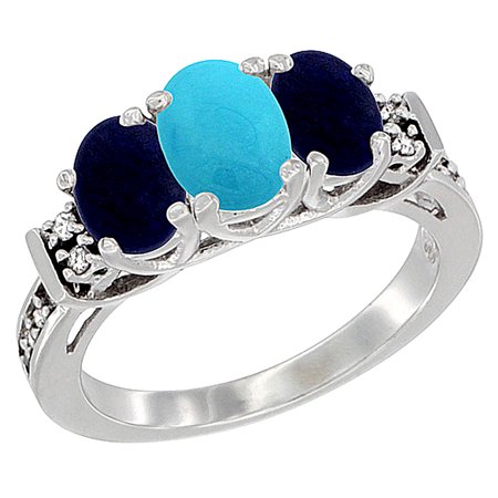 14K White Gold Natural Turquoise & Lapis Ring 3-Stone Oval Diamond Accent, sizes 5-10