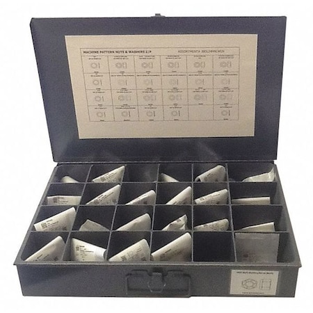 Item:Nut And Washer Assortment; Type:Standard; Material:Low Carbon Steel; Finish:Zinc; System Of Measurement:Inch; Size:6-32 To 1/4"-20; Drive Type:Hex; Driver Size:1/4 In To 3/8 In; Number Of Pieces:575; Number Of Sizes:23; Includes:Hex Nuts (25) Each: 6-32 In, 8-32 In, 10-24, 10-32, 1/4"-20, Lknt Ny 6-32, 8-32, Internal Lock Washers #6, #8, #10, 1/4, Externel Lock Washers #6, 1/4 In, Sae Flat Washers #6, Uss Flat Washers 3/16 In, Metal Compartment Box With Lid; Package Quantity:1;