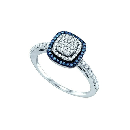 <p><span style="font-size:16px;"><b><u>Description</u></b><br /></span></p> <p><span style="font-size: 14px;">10k White Gold Womens Blue Colored Diamond Square-shape Cluster Ring 3/8 Cttw</span></p> <br /> <p><span style="font-size:16px"><u><b>Gemstone Details</b></u></span></p> <p><span style="font-size:14px">3/8 Carats total weight<br /><br />All diamonds are natural and conflict-free in origin<br /><br /></span></p> <ul type="square"> <b>Round Colored Blue Diamond</b> <br /> <li>1/8 ct.t.w.</li> <li>I2-I3 clarity</li> <li>Blue color</li> <li>Cluster setting</li> </ul> <br /> <ul> <b>Round Diamond</b> <br /> <li>1/4 ct.t.w.</li> <li>I2-I3 clarity</li> <li>I-J color</li> <li>Pave setting</li> </ul> <br /> <p><span style="font-size:16px"><u><b>Specifications</b></u><br /></span></p> <p><span style="font-size:14px">10kt White Gold<br />Widest point width: 10 mm (.39 inches )<br />Width of shank: 1 mm<br />2.74 grams (approximately)<br />Ring size selectable</span></p> <p><span style="font-size:11px">All colored diamonds are treated to permanently alter their appearance.</span></p> <p><span style="font-size:11px">Combined diamond weight of 3/8 carats total weight represents a range of 0.37 - 0.45 cts. t.w.</span></p>