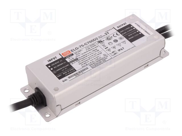Buy ELG-75-C700DA-3Y MEANWELL AC-DC Single output LED Driver (CC+CV) with PFC, 3 wire input, Output 107VDC / 0.7A, Dimming with DALI control technology, IP67..
