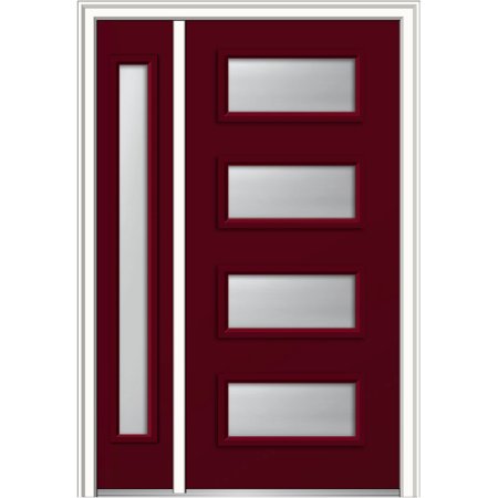 <ul> <li>Door Size: 48"x80"</li> <li>Unit Dimension: 51"x81.75"</li> <li>Rough Opening: 51.5"x82.25"</li> <li>Fiberglass Smooth Door With Sidelite</li> <li>6-9/16" Primed Compostie Frame</li> <li>Spotlight 4-Lite Frosted Glass</li> <li>Door Prefinished Burgundy</li> <li>Left Hand In-Swing</li> <li>Left Hand In-Swing Door Handing - Standing on the inside of your home, if your hinge pins are on your right, you have a Left Hand In-Swing</li> <li>3 Satin Nickel Hinges - 2-1/8" Entry/Deadbolt Bore Prep - *Locks Sold Separately*</li> <li>Brickmould Applied</li> <li>Hinge Side-Left Hand - Sidelite on Hinge Side -Viewed from Exterior of your home sidelite is on the left</li> </ul>