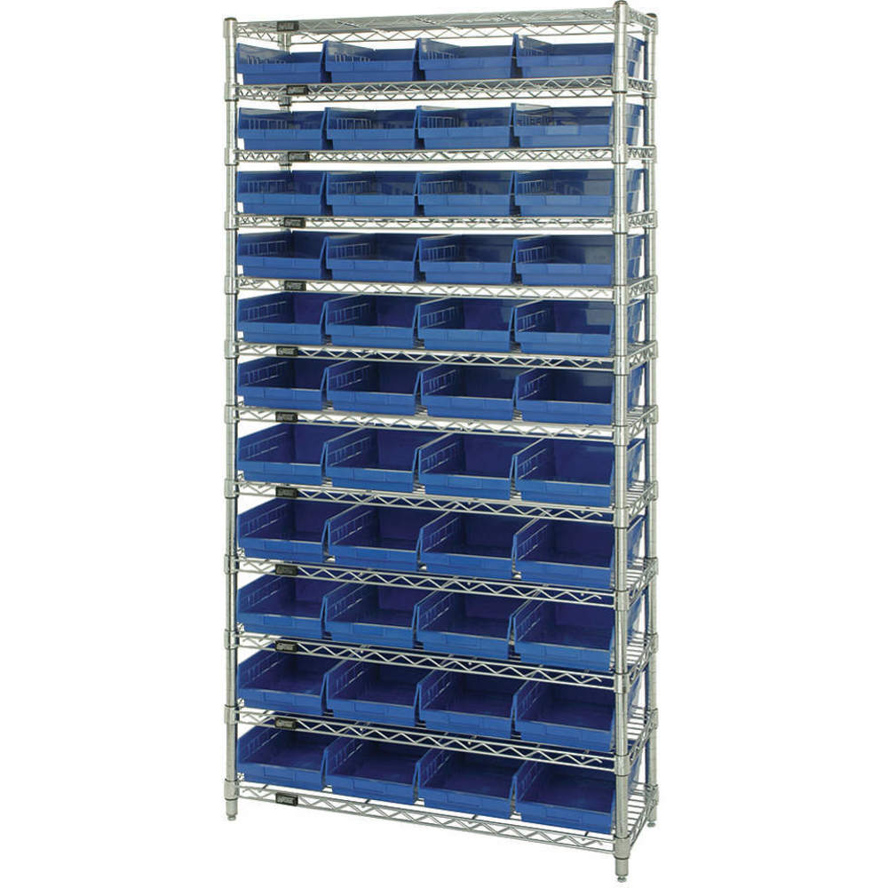 Quantum Storage Systems WR12-108BL 12-Tier Complete Wire Shelving System with 44 QSB108 Blue Bins, Chrome Finish, 18" Width x 36" Length x 74" Height