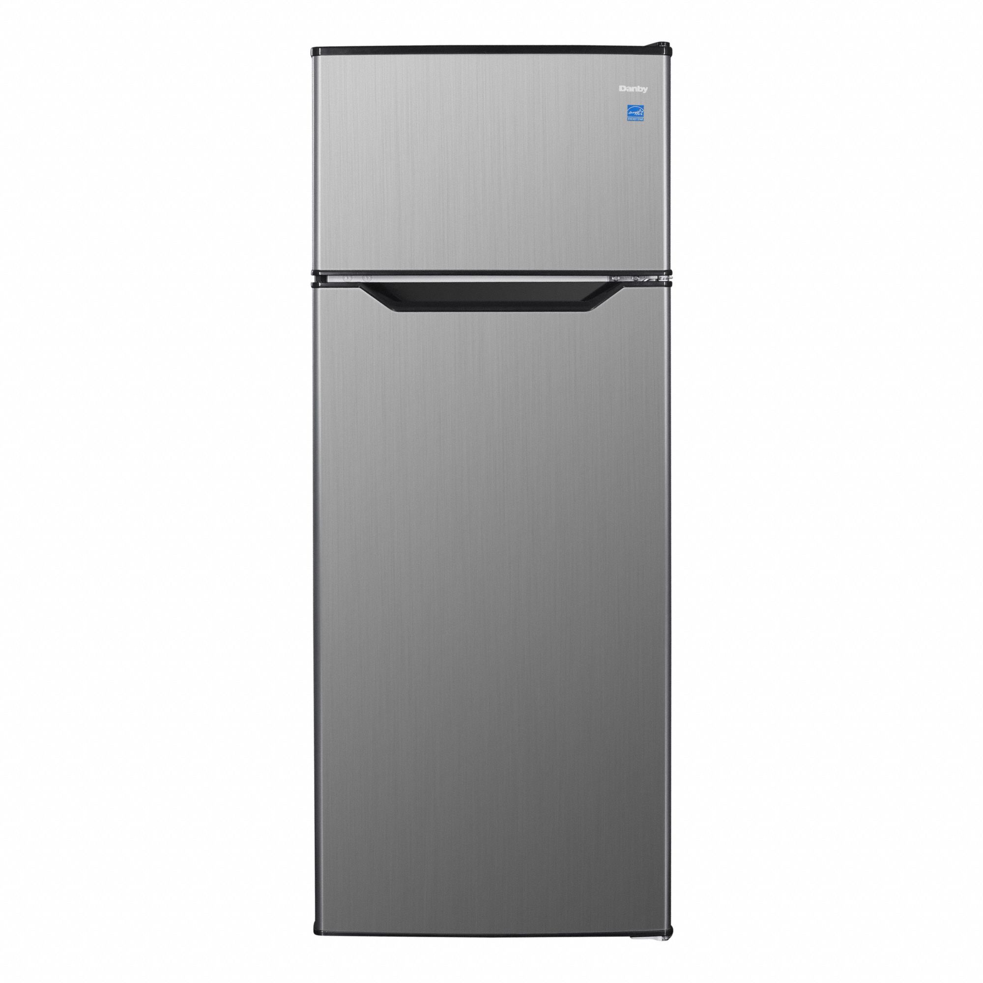 Discover the styling and simplicity of Danby’s 7.4 cubic feet (210 L) stainless-steel top-mount refrigerator, perfect for small space living in a condo, apartment, or townhouse! Reduce your electricity bill and save on energy with this ENERGY STAR rated model. Avoid clutter with two adjustable glass shelves in the fridge and a top-mount freezer section with one adjustable wire shelf. This model also comes with a transparent crisper bin to keep all your favorite vegetables and fruit fresh. Its reversible door hinge allows for a right or left-hand swing so you can fit this unit in almost any space, while its three-door shelves and tall bottle storage make it easy to keep your fridge organized. Choose automatic defrost for the refrigerator and manual defrost for the freezer compartment for easy maintenance all year round.